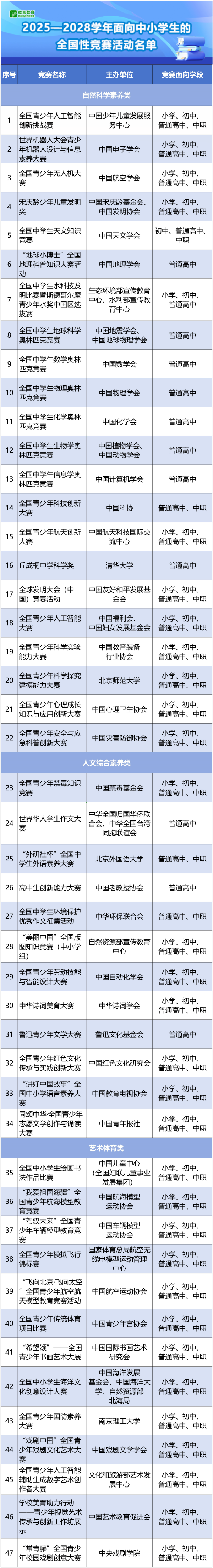 教育部公布2025—2028学年面向中小学生的全国性竞赛活动名单