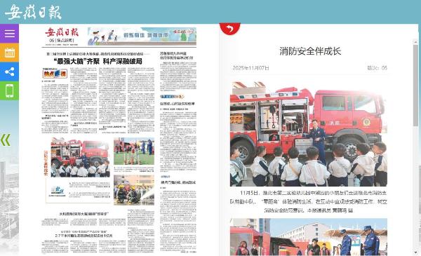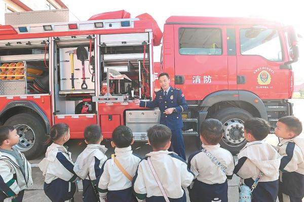 11月5日,淮北市第二实验幼儿园中湖园的小朋友们走进淮北市消防支队特勤中队,“零距离”体验消防生活,在互动中直观感受消防工作,树立消防安全防范意识。本报通讯员 黄鹤鸣 摄