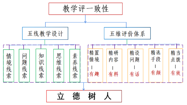 “五五” 教学与评价范式以“教学评一致性”为核心统领,串联起教学与评价的两大并行板块。五线教学设计模块:包含 5 条教学线索,分别是情境线索、问题线索、知识线索、思维线索、素养线索。五维评价体系模块:精置情境(有趣)、精研内容(有料)、精设问题(有话)、精选手段(有颜)、精当点拨(有效)。通过教学设计与评价体系的协同,实现“立德树人”育人目标。