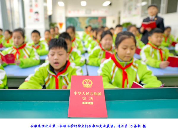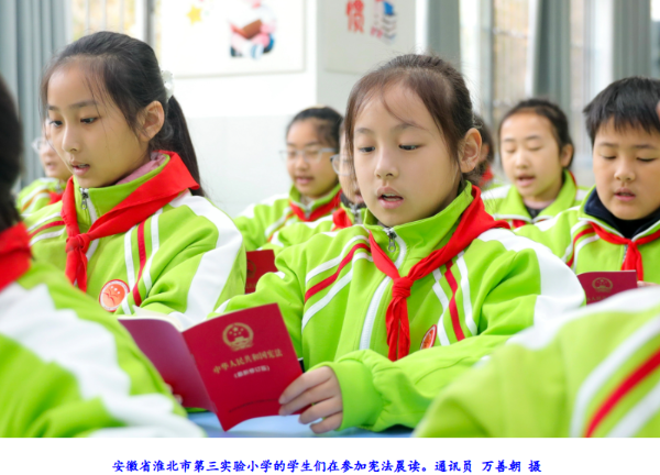 12月1日,安徽省淮北市第三实验小学组织学生开展宪法晨读活动,学生们齐声诵读宪法部分章节、条款,学习宪法内涵,维护宪法权威,弘扬宪法精神,迎接第十二个国家宪法日。中国教育报-中国教育新闻网通讯员 万善朝 摄