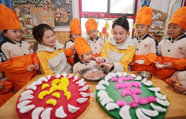 当日,安徽省淮北市第一幼儿园开展“包饺子 迎冬至”主题民俗活动。小朋友们在老师的指导下包饺子、学民俗,沉浸式体验中国传统文化,既锻炼了动手协作能力,又在欢声笑语中感受中华传统文化魅力与节日温暖。(中国教育报-中国教育新闻网通讯员 冯树风 摄)