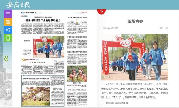 4月6日,淮北七中的高三学子迈过“成人门”。当日,淮北市烈山区举办十八岁成人宣誓仪式,500余名高三学子齐聚淮北七中,举行传统成人礼。学生们通过宣誓、礼拜恩师、朗诵诗歌、迈入“成人门”,向青春致敬,开启人生新旅程。