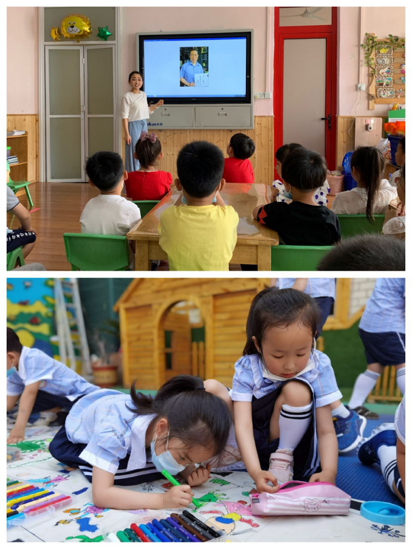 活动中教师们结合视频、图片,通过浅显易懂的讲述,让幼儿知道今天的幸福生活来之不易。看到有些国家的儿童还在饱受战乱之苦,每天都生活在恐惧和饥饿中,孩子们感叹道:“我们生活在和平的国家,真是太幸福了!”“我一定好好好学习,锻炼身体,长大后保卫祖国”……随后教师还给孩子们讲述了袁隆平爷爷、钟南山爷爷等时代英雄的感人事迹,并通过说一说自己的理想、画一画心中的英雄等方式,激励幼儿学习前辈的优秀品质,引导幼儿从小树立爱国报国的远大理想和正确的世界观、人生观、价值观,培养幼儿爱祖国、爱人民、爱劳动、爱科学的情感。