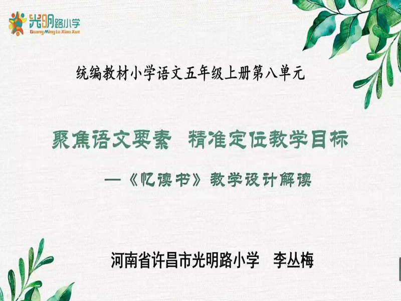 第一节课由河南省许昌市光明路小学李丛梅老师执教统编小学语文五年级上册第八单元的《忆读书》。李老师先做了主题为“聚焦语文要素,精准定位教学目标”的教学设计解读,接着呈现了第一课时的教学过程。李老师在教学中依托课后思考题确立教学路径,将课后思考题中语文要素训练点的学习过程作为教学重点进行实施,让语文要素的训练落地生根。课后,河南省许昌市建安区魏风路小学教育集团许会娜校长作教学点评。她以《忆读书》教学为例,从“聚焦语文要素,精准定位课程目标”、“凸显‘学’为中心,让学生站在课堂正中央”两个方面,阐述了统编教材的阅读教学如何让学习在课堂中真实发生,对参与活动的教师进行了思想和方法上的引领。
