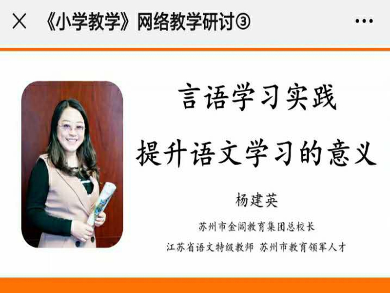 接下来,江苏省苏州市金阊实验小学潘琪老师和苏州市留园中心小学吴妍彬老师分别呈现了他们的录像课,统编教材二年级上册的古诗《夜宿山寺》和五年级上册《鸟的天堂》。两位教师在课堂教学中充分运用现代教育技术手段,教学过程生动活泼,教学效果显著。课后,江苏省语文特级教师、苏州市教育领军人才、苏州市金阊教育集团总校杨建英校长作了精彩的讲座《言语学习实践提升语文学习的意义》。杨校长重点阐述了,为培养学生的语文学科核心素养,教师应从语感实践、语境实践、语用实践、内容重构等方面充分加强小学语文教学的实践表达。