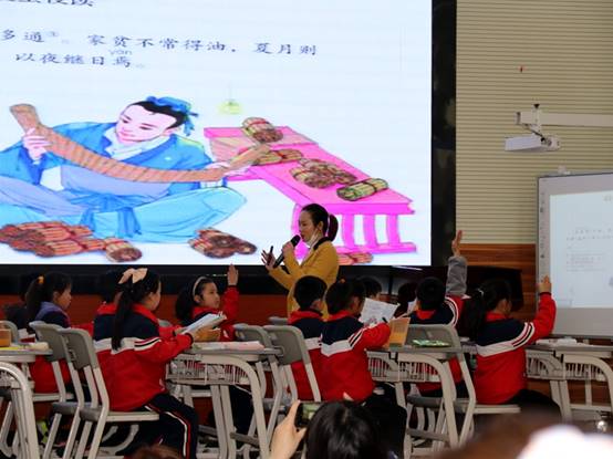 第二节课由市人民路学校的庞婷婷执教《囊萤夜读》,这是一篇文言文,庞老师从文言文介绍自己开始,教学过程中“看注释”“扩词法”贯穿始终,引导学生用自己的方法读懂意思。如果仅仅这么做,让学生互相询问,互相启发,互相讨论,也能达到读懂意思的目的。但庞老师更进一步,她抓住“以夜继日”,和学生一起想象情境,既帮助学生感受到了车胤的勤奋好学,又让学生对文本的理解更上一个台阶——感受到了先概括,再借助事例表现人物的写法。拓展阅读《孙康映雪》,理解文言文的方法,使得学生对人物品质的感悟更加深刻。这样的拓展,将单元人文主题的领悟很自然地与文本内容的理解、方法的习得等融为一体,充分挖掘了文本的多元学习价值。教学过程中突显了文言意识、以学定教、授之以渔、注重一课一得、爬坡意识。从环节上看,简简单单;从思路上来看,清清爽爽;从效果上看,扎扎实实,大道至简。