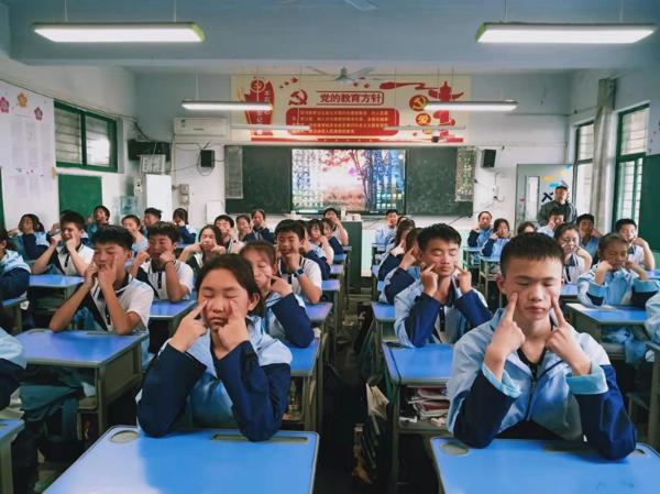 下午两点,同学们端坐在教室里,精神抖擞,衣着整洁,随着眼保健操的乐曲,认真节奏地按揉穴位,整个比赛过程紧张而有序。