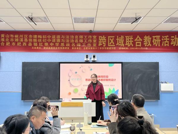 12月12日至12月13日,肥西县教体局、合肥市第四十二中华南城分校和肥西县骆红艳名师工作室牵头的“搭建跨区域教学资源平台 赋能初中道德与法治教学”的跨区域联合教研活动在合肥市第四十二中华南城分校举行。濉溪县教育科学研究室思政教研员黄慧敏和濉溪县田振侠初中道德与法治名师工作室等应邀参加。