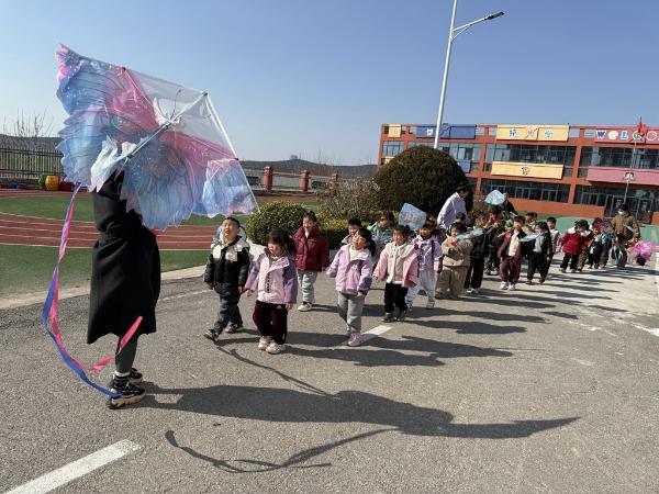 孩子们手中拿着五彩斑斓、形态各异的风筝,排着队来到空旷的田野里。老师先讲了放风筝的方法和注意事项,并做了示范。孩子们在老师的帮助下,在与同伴的合作中,经过多次尝试纷纷放飞手中的风筝。一时间,天空中的老鹰、燕子、蝴蝶等在春风的吹拂下翩翩起舞,还有可爱的哪吒好像在空中大喊“我命由我不由天。”孩子们欢快地奔跑着,呼喊着,笑声回荡在美丽的田野。
