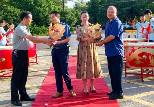 9月10日上午7:00—8:00,在淮北市开渠中学大门口,学校锣鼓社团的同学们排成两列,敲响了欢庆的锣鼓。杜集区党委委员、工会主席、校党总支书记徐兴超、校长刘汉锋等校领导手持鲜花向陆续入校的老师们敬献鲜花。