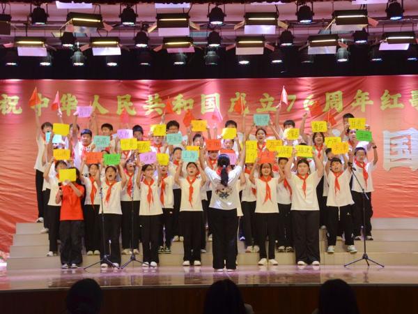 比赛尾声,音乐老师张慕昕走上舞台,手持话筒带领全体师生合唱《歌唱祖国》。“越过高山,越过平原,跨过奔腾的黄河长江……”激昂的歌声响彻礼堂,同学们挥舞着小红旗,有的踮起脚尖,有的跟着节奏拍手,爱国情怀在歌声中深深扎根。