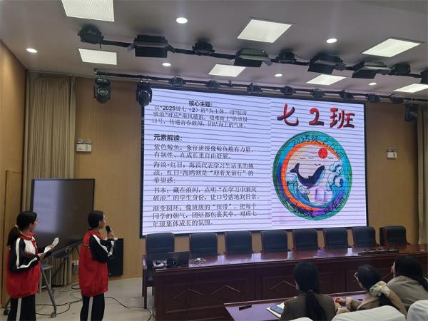 比赛在小学部的活力角逐中拉开序幕。各班级代表依次登台,小脸上写满自信,有条不紊地展示本班的班徽作品,从设计理念、色彩搭配到班主任寄语的融入,讲解得条理清晰。孩子们的作品满载天真烂漫的想象力,明快缤纷的色彩、稚拙却真诚的表达,将班级的憧憬与活力融入每一抹线条,台下师生的掌声与赞叹声此起彼伏,为这份纯粹的创意喝彩。
