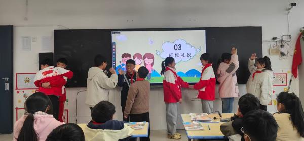 “3”句用语,礼润童心。“你好、谢谢、对不起”,这是文明用语“三件宝”。以班级为单位,召开主题班会。活动现场,学生们在教室前方,学习问候用语,有的握手微笑问好,有的模拟不同场合的礼貌用语,举手抢答环节更让课堂氛围热烈起来。屏幕上“问候礼仪”的课件内容,搭配生动的互动演示,让孩子们在实践中掌握文明问候的方法。