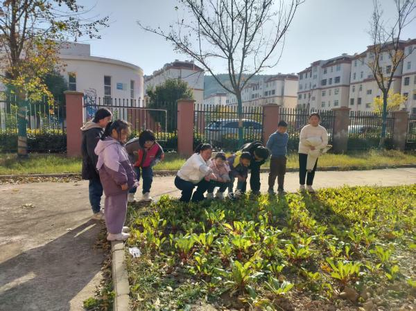 校园的种植园更是成了“实践关爱小课堂”。老师带着孩子们蹲在菜畦边,辨认蔬菜品种、讲解种植、农作物生长知识,示范田间观察方法,让学生在亲近自然的实践中,既拓展了认知视野,也体会到劳动与成长的联结。阳光洒在稚嫩的笑脸上,好奇的提问与耐心的解答交织成生动的成长画面。“原来这是萝卜苗呀!”“叶子要这样观察才能区分品种。”简单的互动里,藏着对孩子好奇心与实践力的呵护。