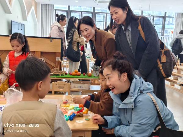深度跟岗:在真实场景中体悟细节。工作室成员深入班级,开展为期半天的“沉浸式跟岗观摩”。老师们分组入班,零距离观察普特融合的集教活动、个别化教育实施及家园共育的日常点滴。这种深入肌理的学习方式,让老师们不仅看到了成功的教育策略,更洞察到支持这些策略背后的教育观、儿童观与环境创设的巧思,实现了从“观看”到“洞察”的升华。