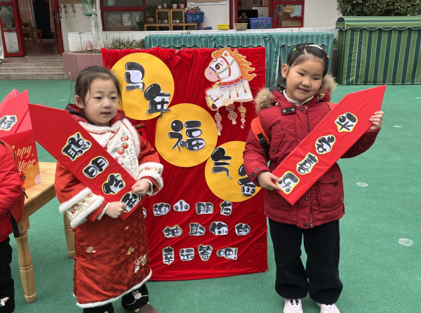 入园处,老师们精心打造的互动打卡区成为亮点。孩子们在“马上有福”展板上为红马贴福字,敲响“敲好运”锣鼓传递喜悦,摸“拍马屁”气球马屁股祈愿顺遂,抽福签纳吉迎新。在“2026”主题展板前,家长与孩子共同创作小花、小马手工作品并粘贴打卡,亲子温情满满。