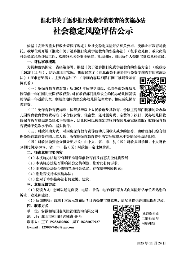淮北市关于逐步推行免费学前教育的实施办法社会稳定风险评估公示