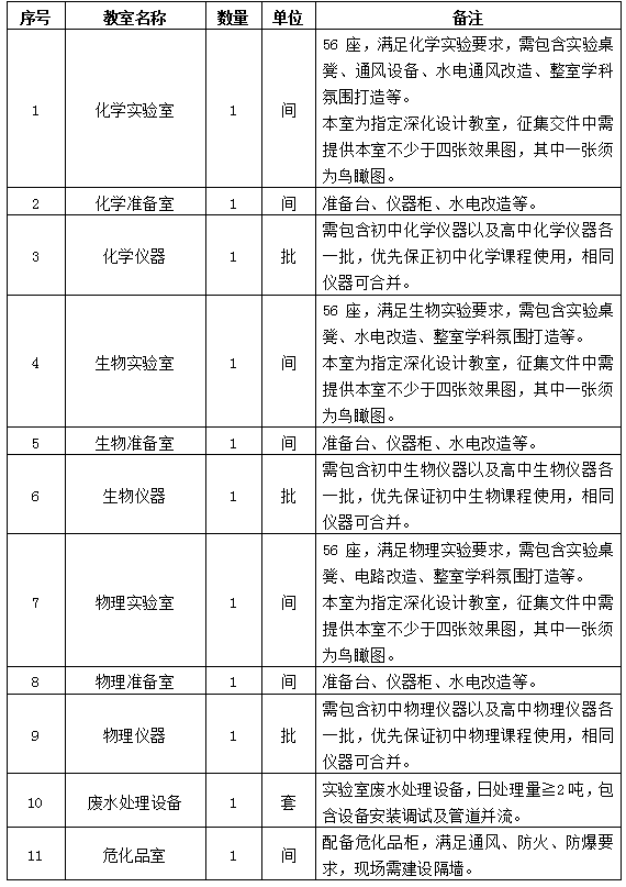 为满足学校现代化教学的保障,提升学生操作实践能力和改善办学环境的实际需要,实现教学目标,现面向社会公开征集理化生实验室建设项目方案。