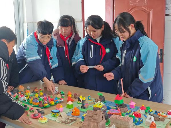 活动现场,学生们围聚在摆满手工作品的桌前,兴致勃勃地交流创作思路与制作心得。桌上的作品琳琅满目,彩泥捏制的房屋、动物栩栩如生,泥塑造型古朴生动,作品错落摆放,每一件都凝聚着学生的想象力与巧思。从作品构思到材料选择,再到动手制作,学生们全程自主参与,在揉、捏、搓、粘的过程中,不仅锻炼了手部精细动作,更学会了团队协作与创意表达。
